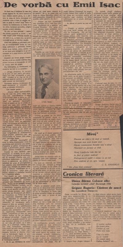 Interviu despre rostul poeziei, acordat de Emil Isac ziarului ”Națiunea Română” (Cluj), în numărul din 6 septembrie 1936.